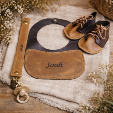 Personalised Leather Baby Gift Set – Dummy Clip, Bib & Shoes